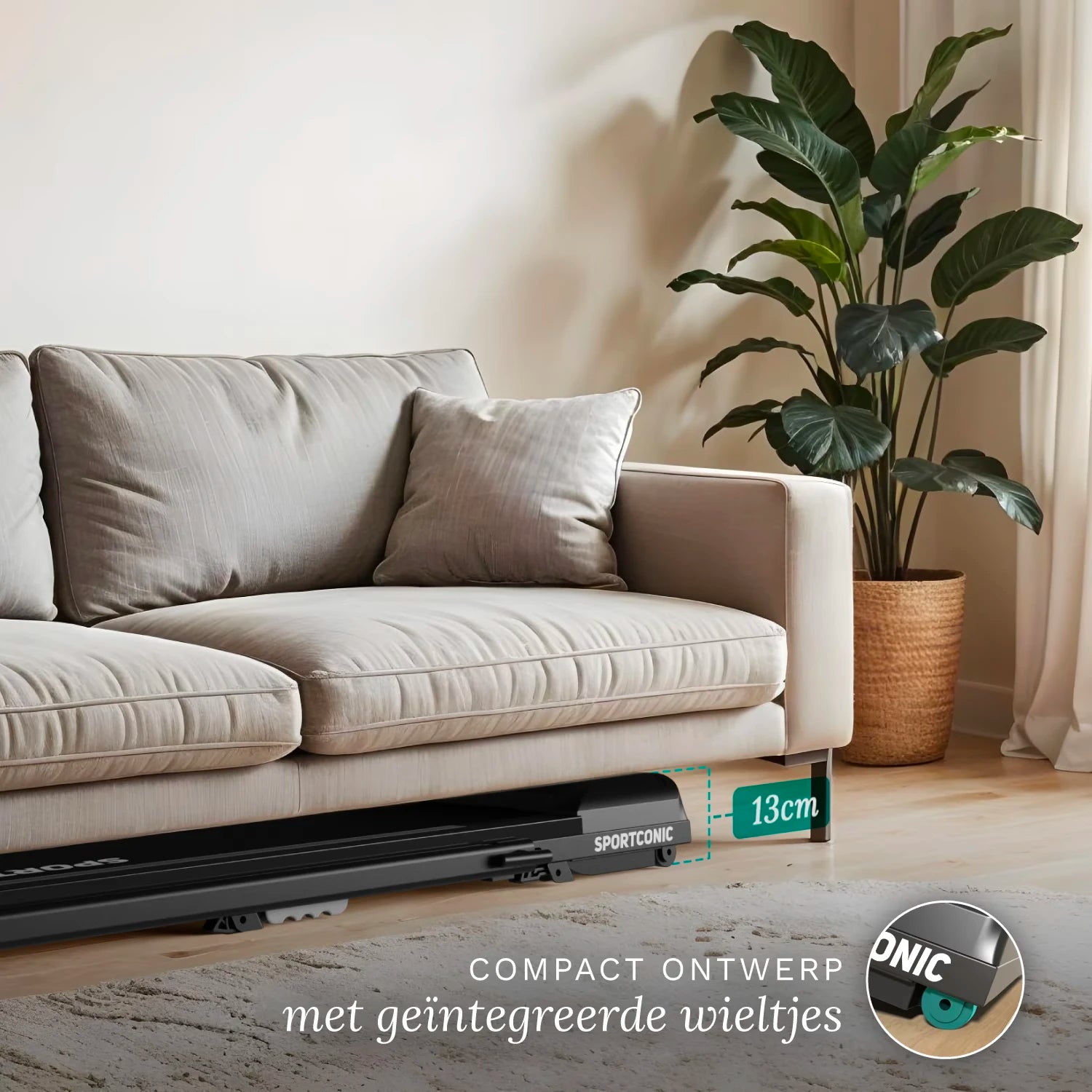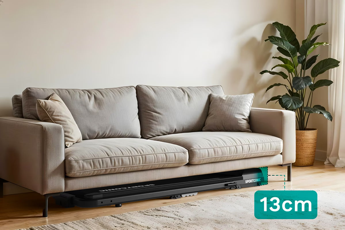 Dėl išmanaus ir kompaktiško dizaino bėgimo takelis idealiai tinka naudoti namuose. Sulankstytas, jo aukštis siekia vos 13 centimetrų , todėl jis lengvai slysta po sofa, lova ar spintele. Integruoti ratukai leidžia jį greitai ir lengvai perkelti net ir mažesnėse gyvenamosiose patalpose.